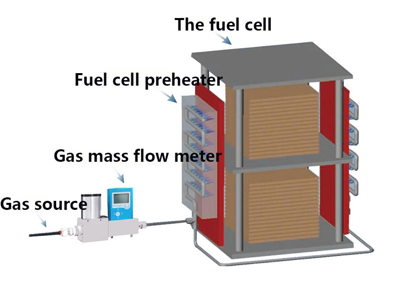 In traditional fuel cell stacks, gas flow meter is often used to adjust the flow of gas fuel into the preheater (hydrocarbon fuel system), or to adjust the hydrogen and air