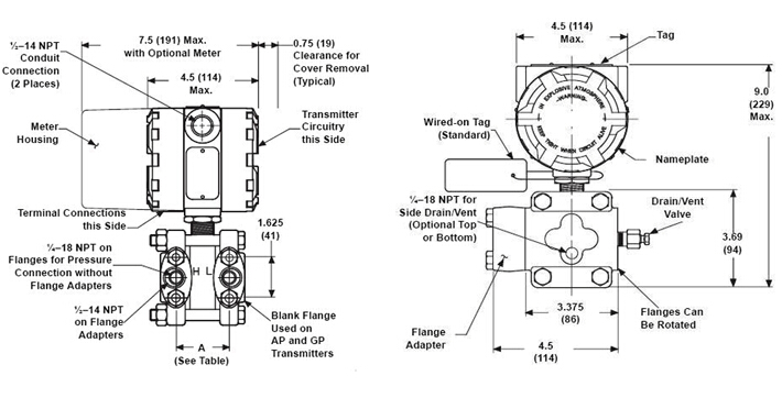 Mounting | Directly supported by piping or optionally with mounting bracket for 2" pipes or with direct or remote seals. 3-way valve | |