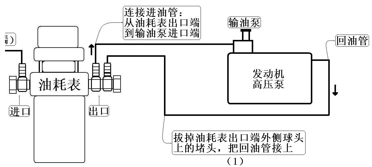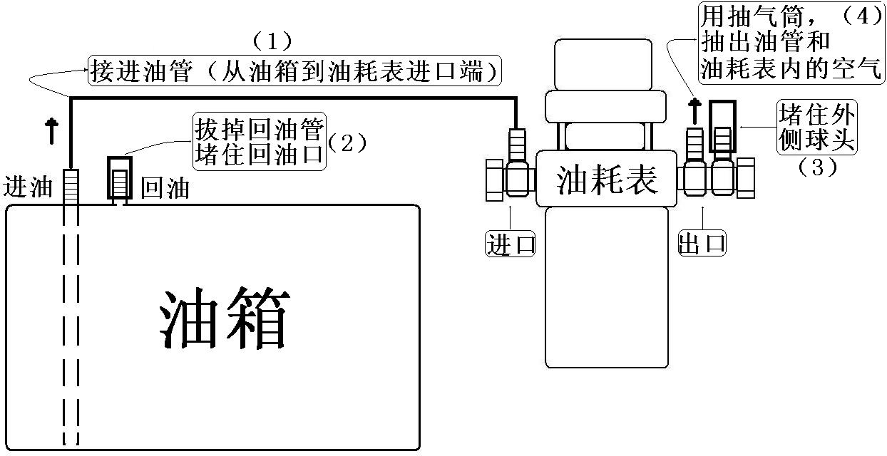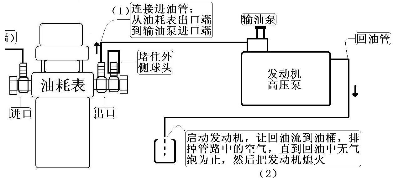 (1) 連接進(jìn)油管,從油耗表出口端內(nèi)測(cè)球頭到輸油泵進(jìn)口端