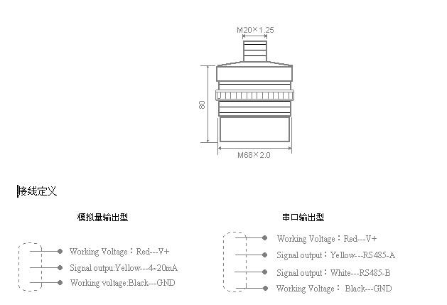 輸出信號(hào)4~20mA三線制(默認(rèn));RS485(可選項(xiàng),另可定制其它輸出方式)