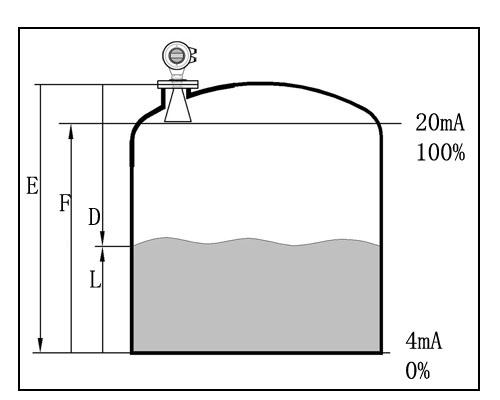 通過輸入空罐高度E(=零點(diǎn)),滿罐高度F(=滿量程)及一些應(yīng)用參數(shù)來設(shè)定,應(yīng)用參數(shù)將自動(dòng)使儀表適應(yīng)測(cè)量環(huán)境。對(duì)應(yīng)于4-20mA輸出。