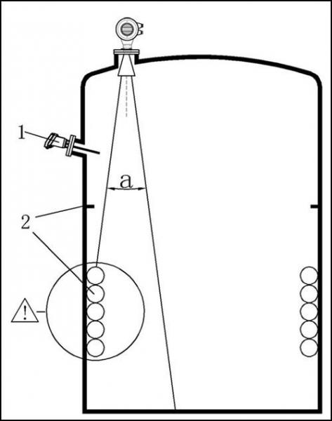 l 如果罐內(nèi)有(1)(2)干涉物件,應(yīng)采用導(dǎo)波管進(jìn)行測(cè)量。