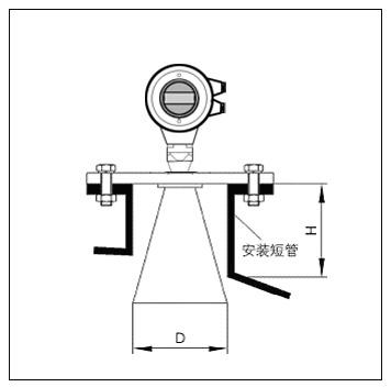 l 如果喇叭直徑大于安裝短管的直徑,包括延伸管在內(nèi)的天線需要從容器里面安裝,并將儀表抬高。選擇延伸管使儀表至少抬高100mm。
