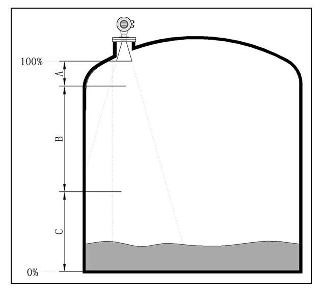 l 若介質(zhì)為低介電常數(shù)當(dāng)其處于低液位時(shí),罐低可見,此時(shí)為保證測(cè)量精度,建議將零點(diǎn)定在低高度為C 的位置。